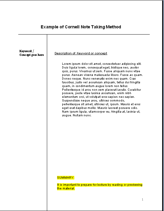 The Cornell Method is based on two columns: one containing the keyword or concept, and the other containing the description or notes associated with the keyword or concept. This method can be used while listening to the lecturer. In the right hand column, you can list the main ideas or write a paragraph and then on the left hand side note the keyword or concept that relates to your section of notes. At the bottom of the page you should write paragraphs summarising the information contained in the notes. Because this note-taking method identifies key concepts and also summarises main ideas, this can be a useful method for later revision.